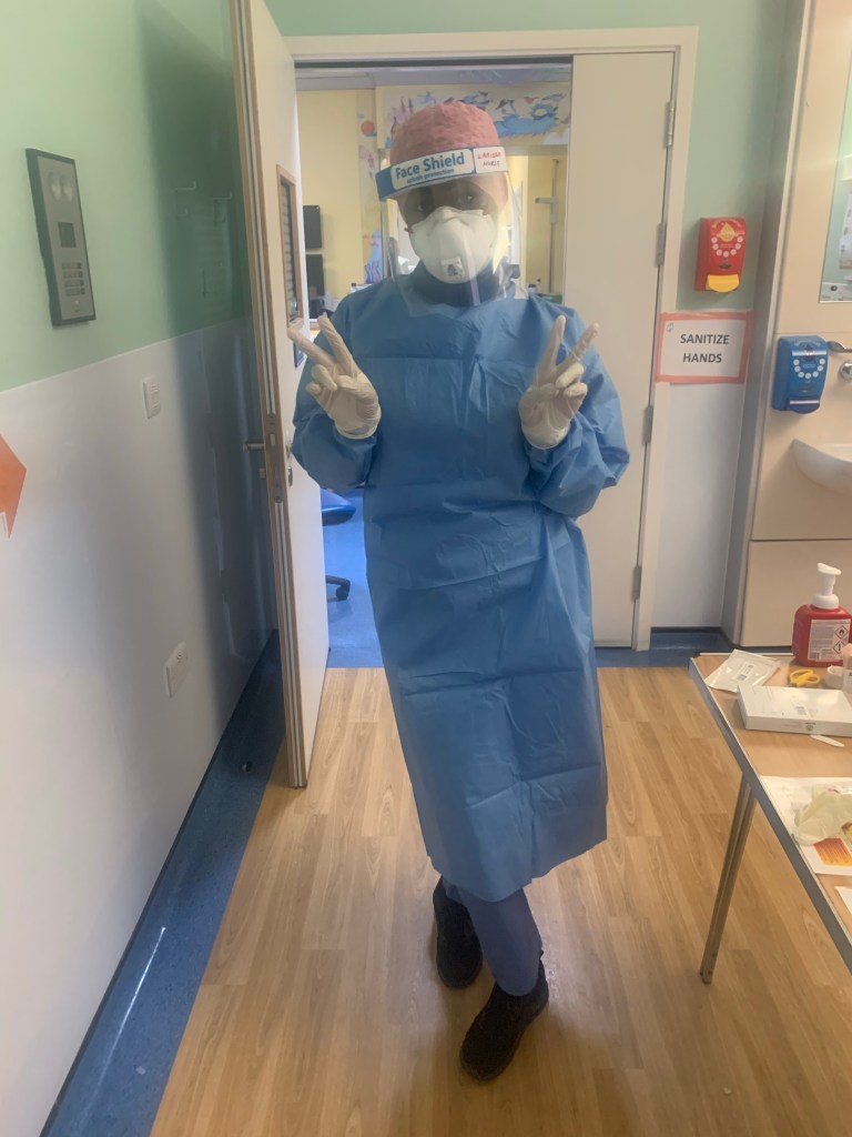I tell you the truth, every NHS worker has felt like a soldier at war literally even to the physical gear (PPE). You have different stations with different groups of people helping you gear up to get you dressed & undressed (donning & doffing) with your mask, your gowns, your visors & your new shoes (crocs) ONLY for battle. You have 2 labels – one on your head & your back it has your ‘name’& ‘role’(nurse) – that’s the only way to identify who is who in there.